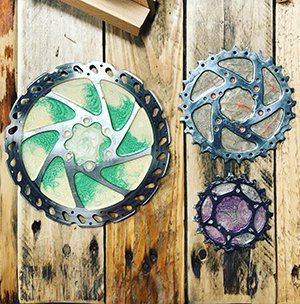 Rachel collects bicycle parts that are bound for the scrap heap and makes beautifully crafted items from them.  She uses reclaimed fabrics with inner tube to make bags, coloured pouring resin with metal sprockets to make coasters and even nuts and bolts to make candle holders.  Each item Rachel creates is unique.